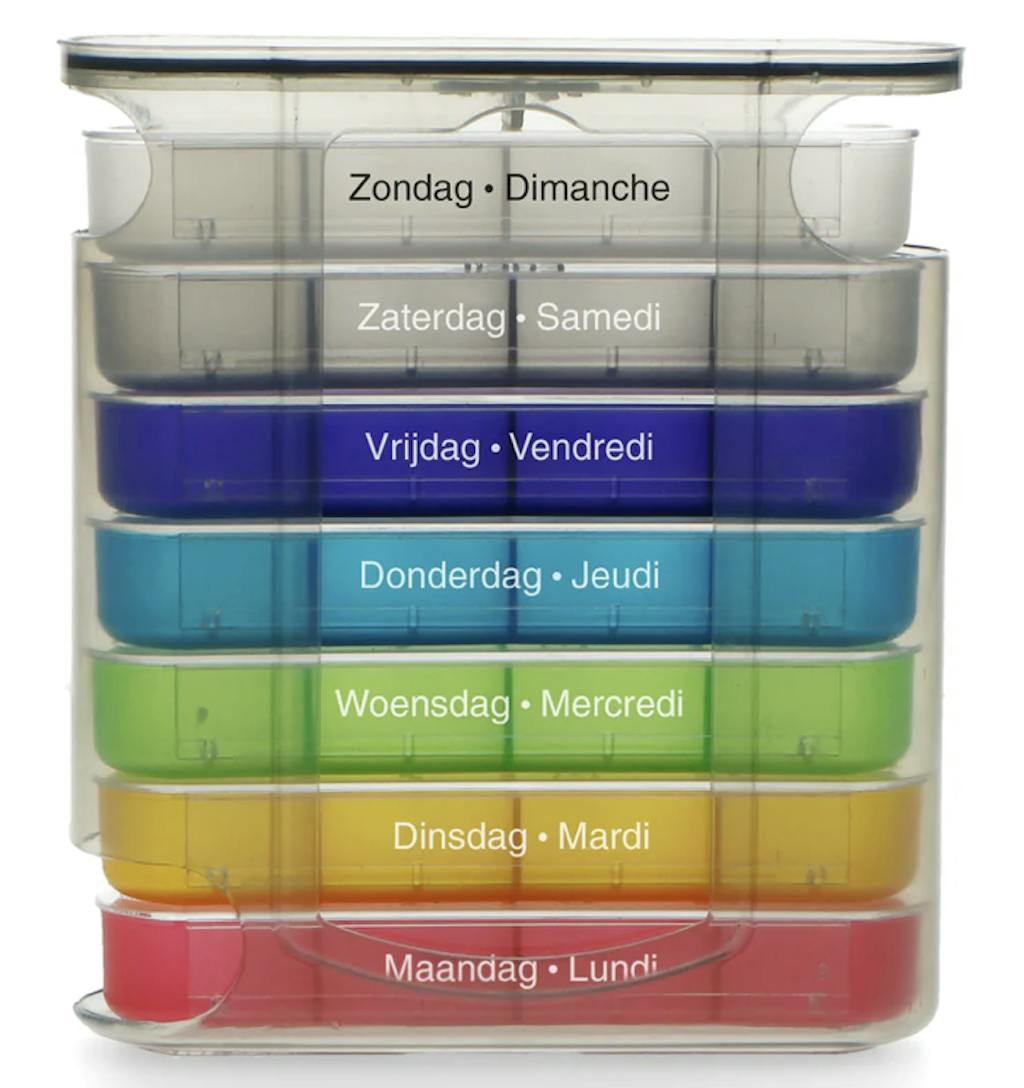 - Het doosje bestaat uit zeven vakjes; één voor elke dag van de week.