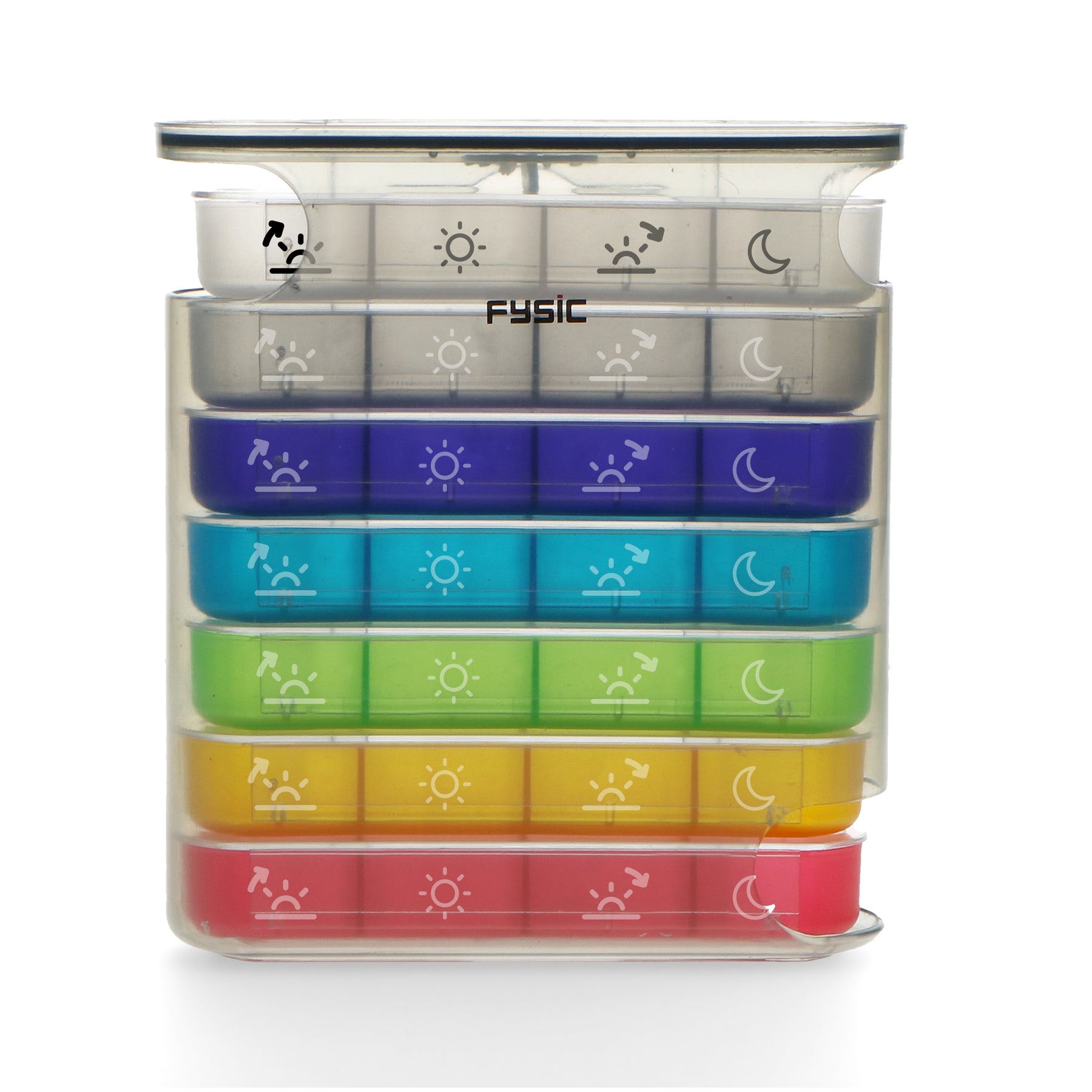 - Verkrijgbaar in de kleur transparant met gekleurde dag-doosjes